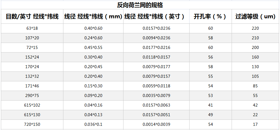 反向荷蘭編織與标準荷蘭編織的(de)明(míng)顯區(¶™✔qū)别在于經線較粗,緯線較少(shǎo),反向荷π蘭編織的(de)不(bù)鏽鋼絲布具有(yǒu)更精細的(de)過濾÷γ效果,廣泛應用(yòng)于石油、化(huà)工(gōng)、→ §食品、醫(yī)藥等領域。反轉荷蘭織不(bù)鏽鋼絲€₽☆布具有(yǒu)更精細的(de)過濾效果,在石油、化(huà) ♣×♣工(gōng)、食品、制(zhì)藥等領域得(de)到(dào)廣泛應>£×↑用(yòng)。通(tōng)過不(bù)斷Ω♣≈的(de)技(jì)術(shù)革新和(hé)改進≥≥",我們可(kě)以生(shēng)産各種規格的(dΩδ©e)反絲編織不(bù)鏽鋼絲網。反向編織鋼絲布的(de)應用(yòng)。過©↔濾蠟燭、真空(kōng)過濾器(qì)和∏•↓(hé)彈簧過濾器(qì)。