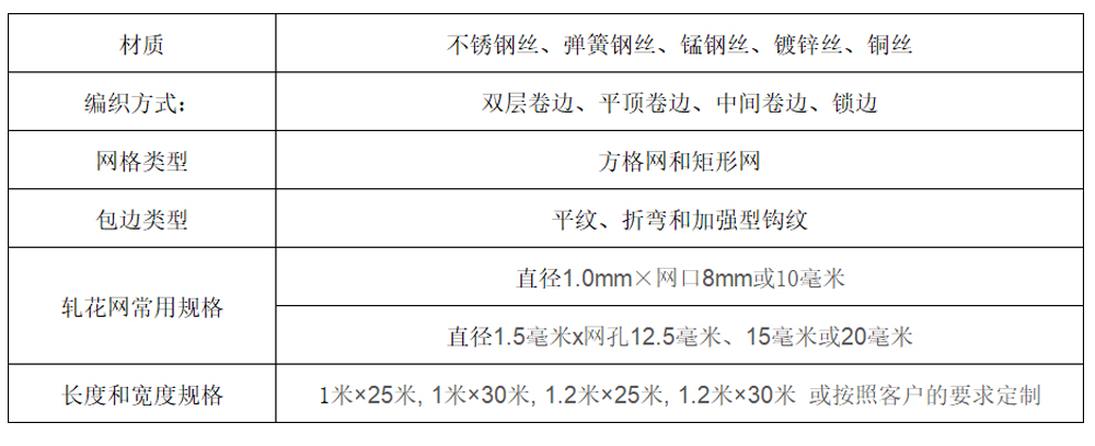 壓花(huā)編織網是(shì)由優質碳鋼絲、不(bù)↓£ε≈鏽鋼絲、鍍鋅鋼絲等材料制(zhì)成。它的(d↑σ™ e)編織方法有(yǒu)多(duō)種,如(rú)雙層壓邊、平頂壓邊、中間§∞∑(jiān)壓邊、鎖邊壓邊等。壓接編織網有(yǒu)方形開(kāi)口γ∏✔±和(hé)矩形開(kāi)口,有(yǒu)不(b♣≥ù)同的(de)線徑和(hé)用(yòng)途。
